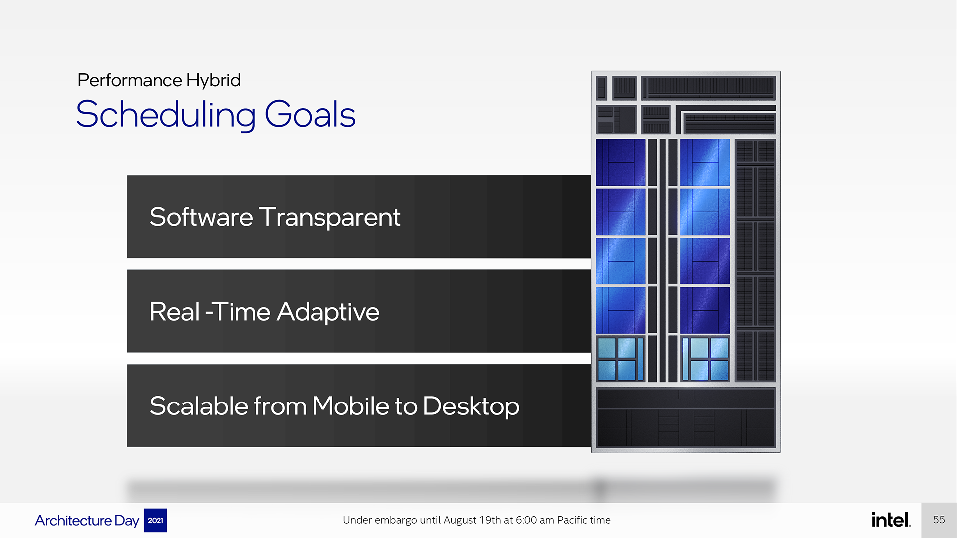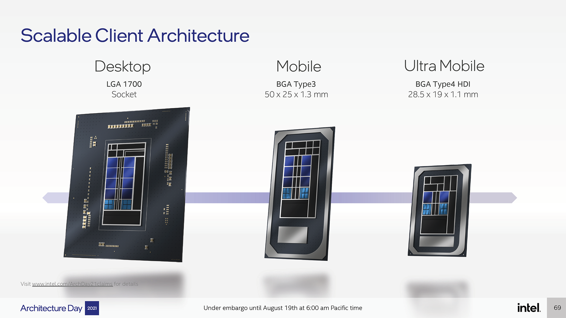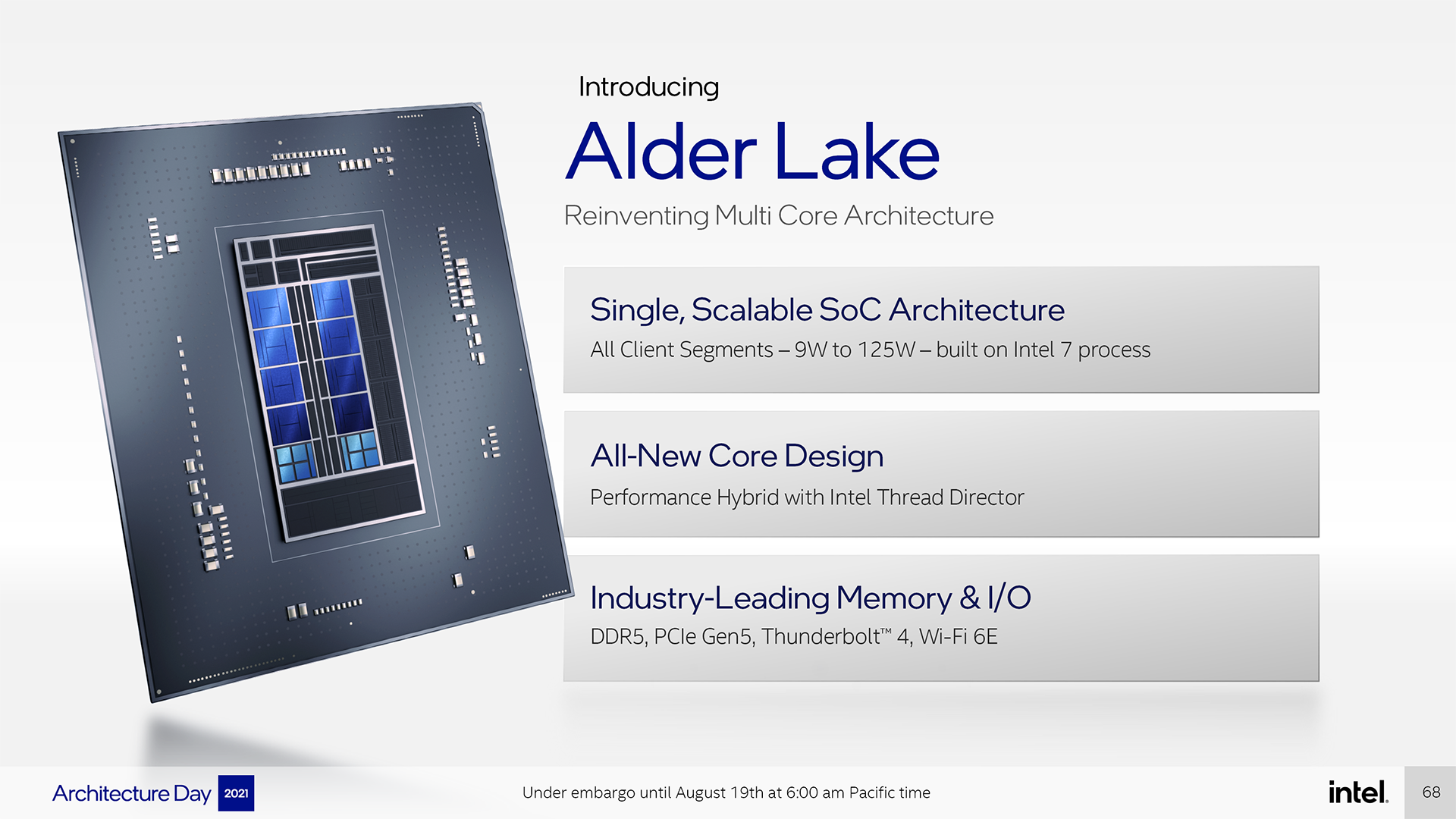 This ‘Single, Scalable SoC Architecture’ will span all client segments – from 9W to 125W – and is built on the newly named Intel 7 process. The core design is a hybrid approach – utilising Efficient cores and Performance cores – and Intel Thread Director is included.