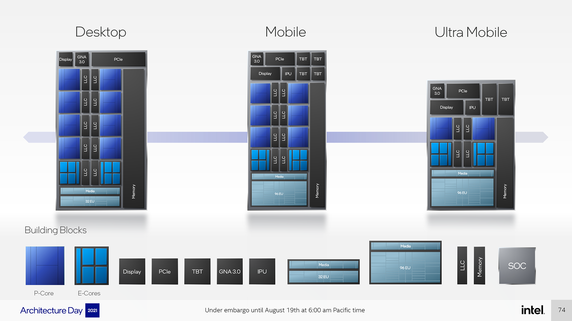 Intel’s building blocks approach looks to be designed to adjust the processors based on their use cases. This is not too dissimilar to what we already see. For example, desktop Alder Lake chips may have lesser focus on iGPU performance, but more CPU Performance cores. While some Mobile chips may trade CPU Performance cores for a large slice of iGPU silicon.