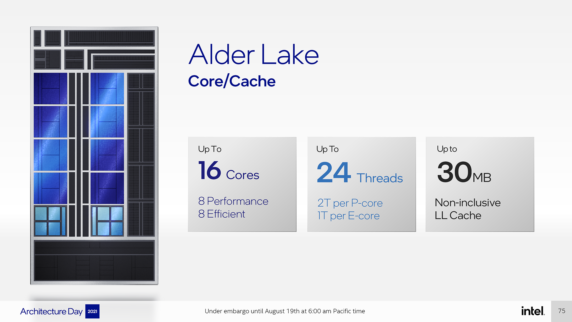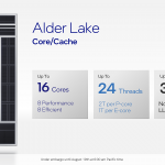 Notably, Alder Lake will scale up to 16 total cores but that is split as 8 Performance cores and 8 Efficient cores. The Performance cores support Hyperthreading, but the Efficient cores do not. So this is up to a 16 Performance thread plus 8 Efficient thread design.
