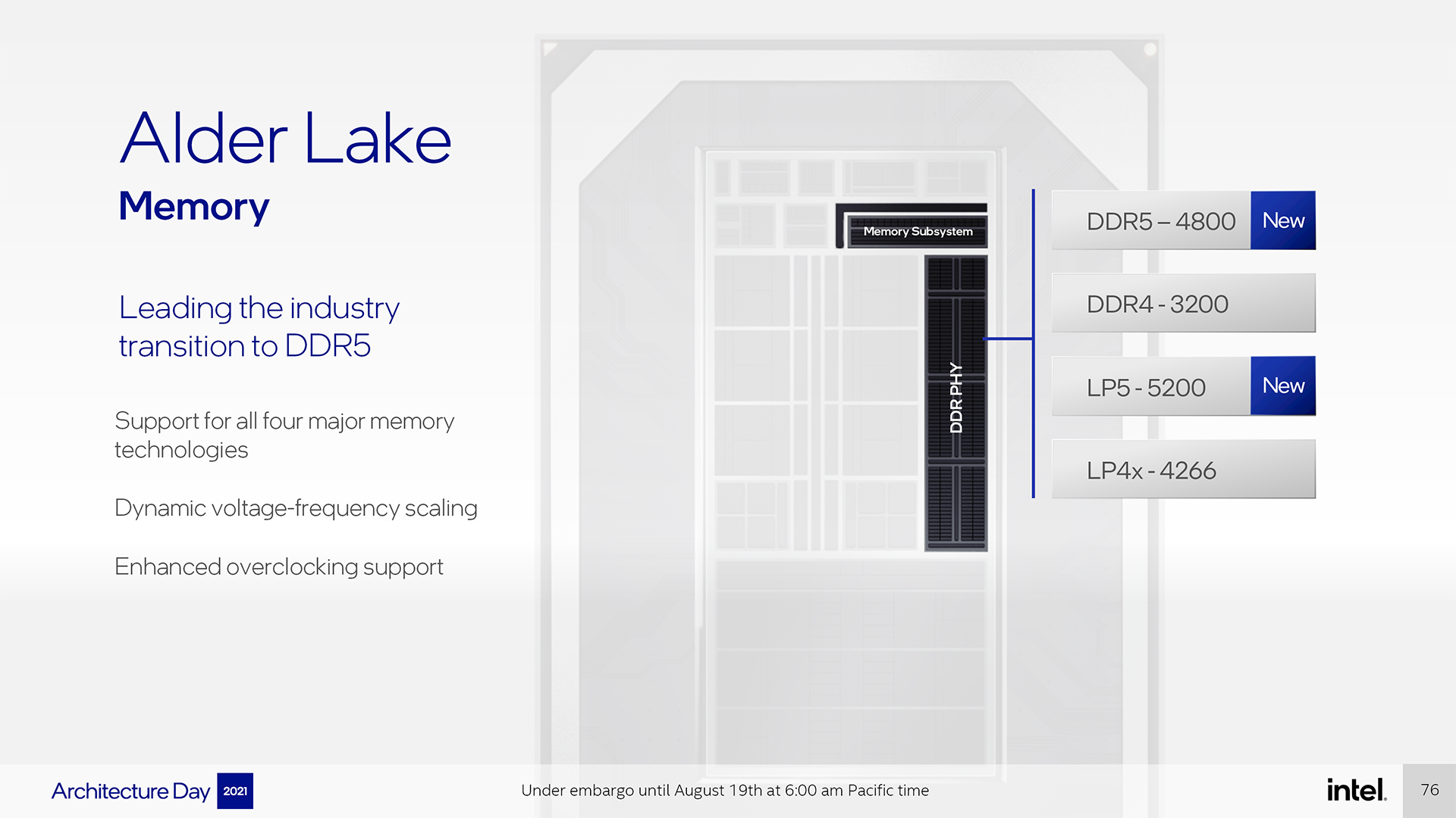 Memory support is vast with Alder Lake. Conventional DDR4-3200 and DDR5-4800 will be supported alongside LPDDR5-5200 and LPDDR4x-4266. Being the first mainstream platform to adopt DDR5 could give Alder Lake some inherent advantages, especially in the domain of integrated GPU performance.