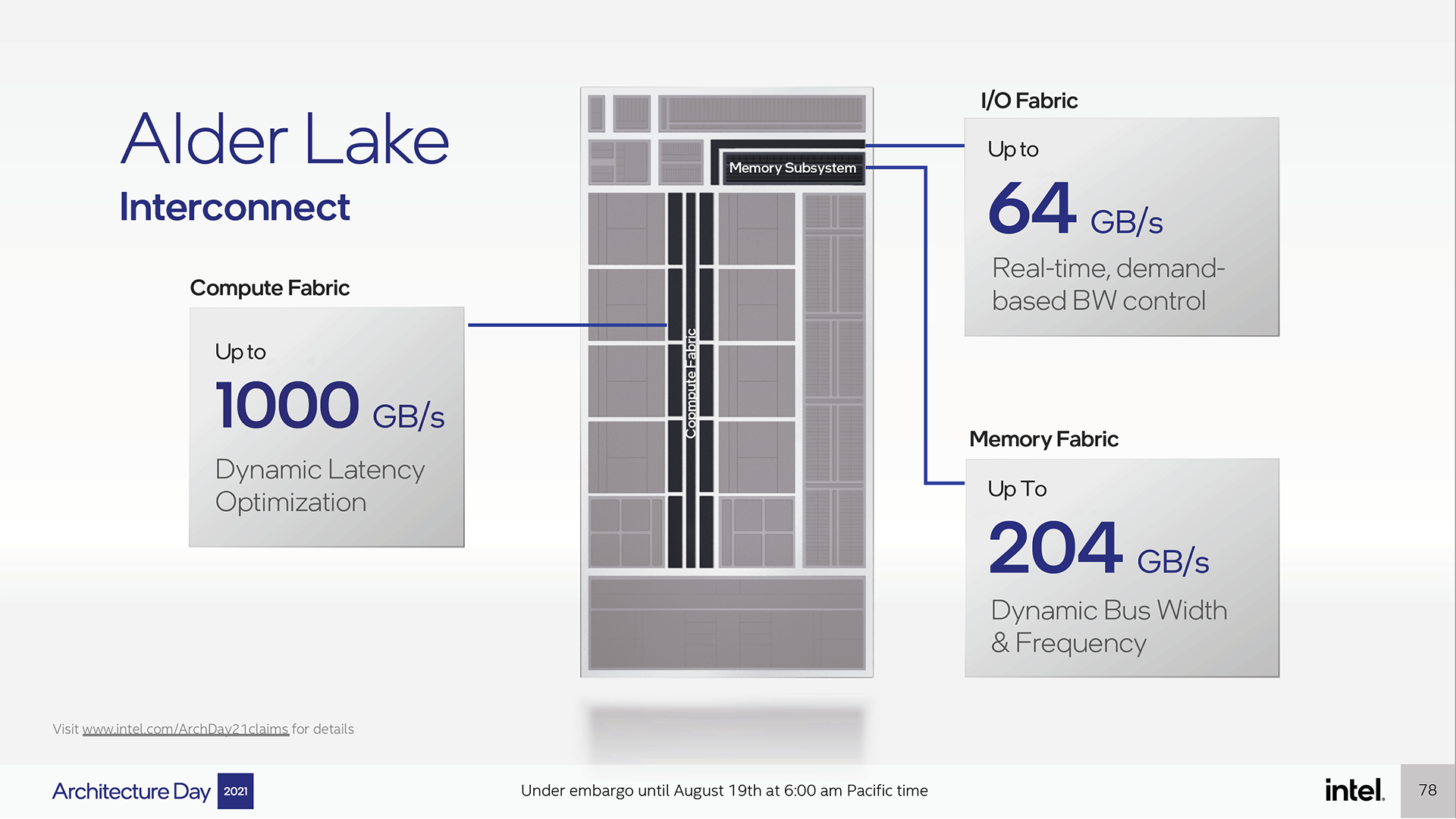 Intel is also highlighting some pretty loft interconnect bandwidth numbers for Alder Lake. The Compute Fabric – which looks to be translating data between the CPU cores – is rated as up to 1000GB/s with dynamic latency optimisation. And the IO Fabric’s up to 64GB/s perhaps spells a greater focus on ensure ample connectivity between the CPU and partnering platform expansion devices. Memory is rated as up to 204GB/s.