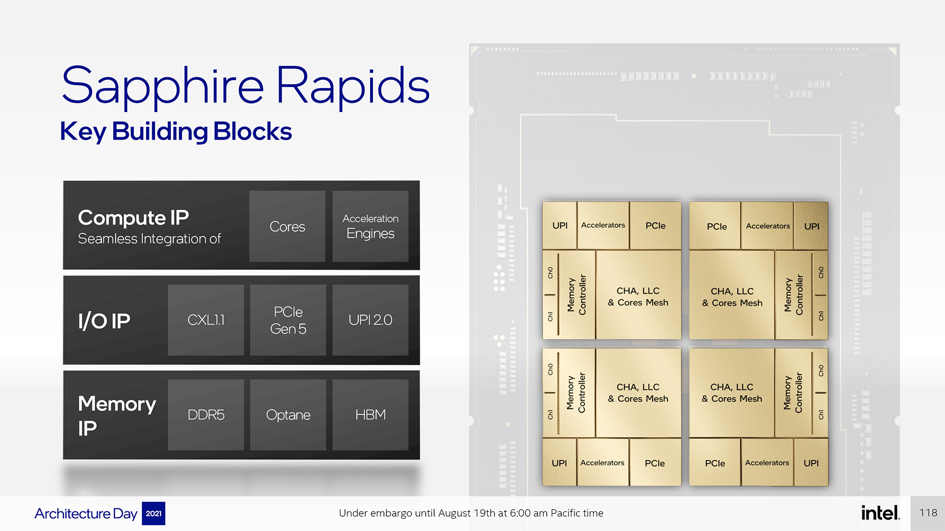 Looking briefly at Intel’s new Sapphire Rapids Xeon Scalable processor for data centre usage, Intel has opted for a multi-tile design to increase product scalability. This is – in essence – what AMD does with its chiplet approach for the Zen silicon found in EPYC data centre processors. Though Intel’s implementation looks to be very different, with each tile having its own full set of resources, as opposed to the centralised IO die approach that AMD has used for Zen 2 and Zen 3 EPYC.