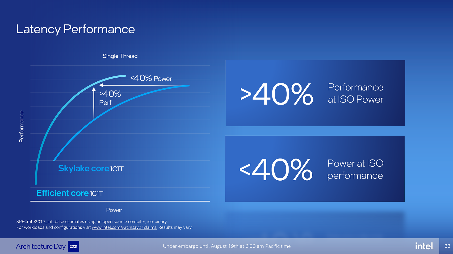 Using Skylake core as a comparison point, Intel is highlighting latency and throughout power and performance gains – simultaneously – on both a 1C1T basis and also with the new 4C4T Efficient core going up against 2C4T of Skylake architecture.