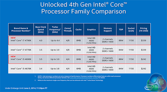 Perhaps of greatest importance is the fact that Devil's Canyon parts have replaced the Haswell 4670K and 4770K without any form of price bump. Tray price remains firm at $339 for the i7 and $242 for the i5. Current retail pricing looks identical to Haswell's ‘K' chips, with the 4790K commanding around £260-270 and the 4690K selling for under £190.