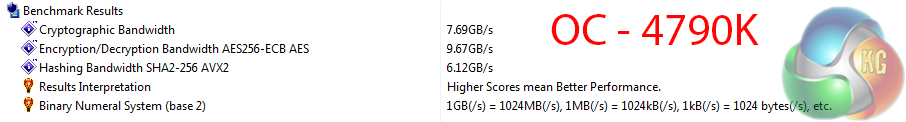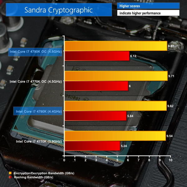 Hashing bandwidth of the processors also scales effectively with operational frequency, so it's no surprise that the overclocked Devil's Canyon part takes the lead in the Sandra Cryptographic test.