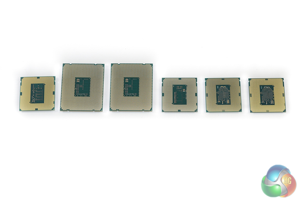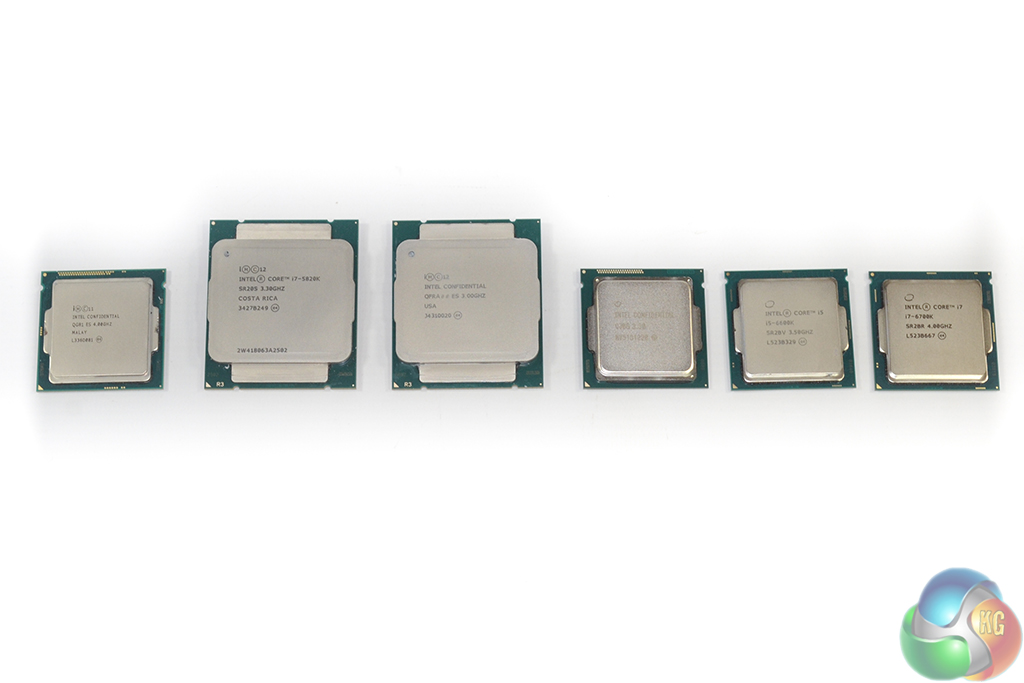 From left to right: Devils' Canyon i7-4790K, Haswell-E i7-5820K, Haswell-E i7-5960X, Broadwell i7-5775C, Skylake i5-6600K, Skylake i7-6700K.