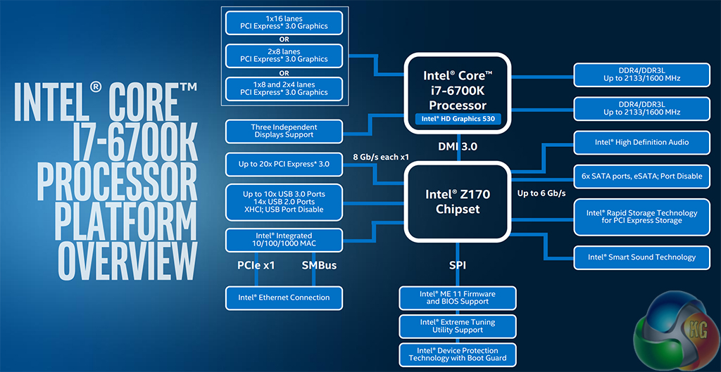 The Skylake CPUs support sixteen PCIe 3.0 lanes. That bank of sixteen can be deployed as 1×16, 2×8, or 1×8 + 2×4, making 2-card SLI (which demands a minimum x8 link) and 3-card CrossFire possible. That, if you ask me, is not a particularly future-proof decision on Intel's part. Users wanting 2-card SLI or high-bandwidth CrossFire in addition to a PCIe 3.0 x4 NVMe SSD (which are set to become far more commonplace over this platform's life-cycle), will be forced to handicap the ultra-fast storage drive by running it through the higher-latency chipset-fed PCIe 3.0 lanes. Outfitting the CPU with 20 PCIe 3.0 lanes would have been a smarter move.