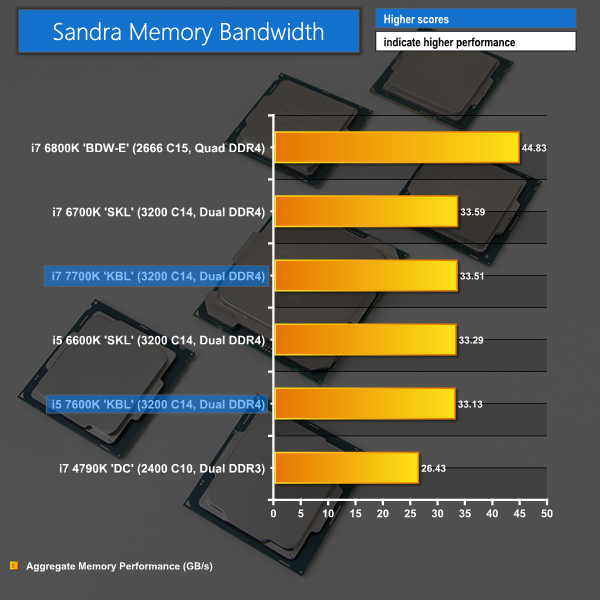 Memory bandwidth is essentially a proxy for showing the performance of memory modules. With that said, the HEDT BDW-E chip's ability to use quad-channel DDR4 nets it the performance lead. Higher-speed DIMMs than the 2666MHz modules that we used would easily break the 50GBps bandwidth barrier. Kaby Lake hits 33GBps of memory bandwidth when using a pair of 3200MHz G.Skill DIMMs. Devil's Canyon is left lagging behind due to the use of dual-channel 2400MHz DDR3 memory.
