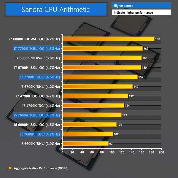 Performance in the Processor Arithmetic test is interesting as the overclocked i7-7700K manages to overcome its core count disadvantage and outperform a stock-clocked 6800K. Other than that, performance is still generally how we would expect it to be – Kaby Lake is faster than Skylake by virtue of its higher clock speeds.