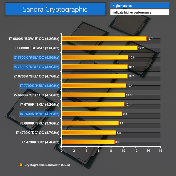 The Cryptographic benchmark shows tendencies for liking architecture performance, clock speed, and also core count. Kaby Lake chips perform better than their core count would suggest (against BDW-E and DC) by virtue of the well-designed Skylake microarchitecture and high clock speeds.