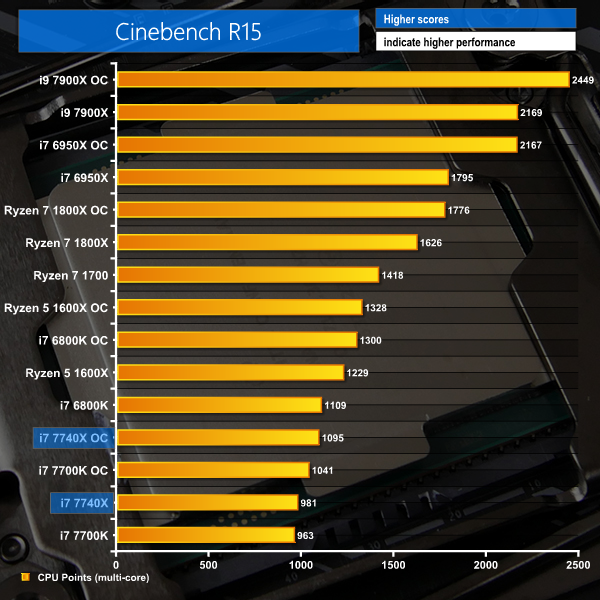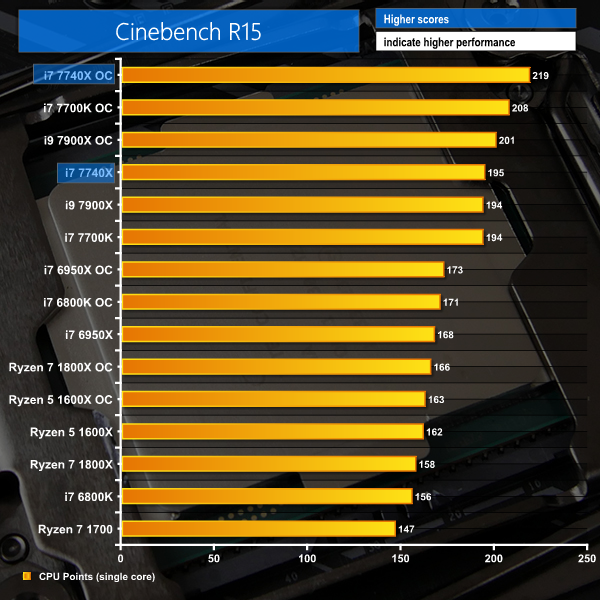 Single-core performance is a clear strength for the 7740X thanks to its Skylake-based microarchitecture and very high operating frequencies. When overclocked to 5.1GHz, the quad-core Kaby Lake-X i7 establishes a very comfortable lead in the Cinebench single-threaded test.