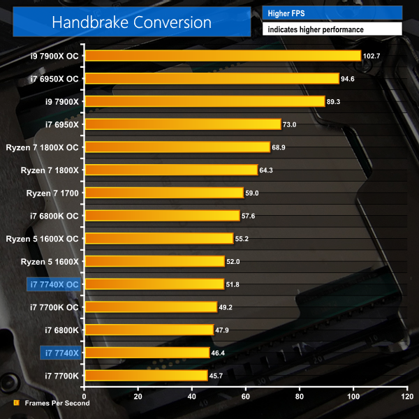 The Core i7-7740X's performance in our CPU-heavy, multi-threaded benchmarks is unsurprising. A slight frequency bump over the 4C8T 7700K allows the 7740X to offer slight performance improvements in all circumstances (1.9% in Cinebench, 1.5% in Handbrake, and 2.4% in x265 encoding). However, compared to the similarly-priced Ryzen 7 1700, Intel's quad-core processor is well-and-truly beaten when focussing on multi-threaded performance.