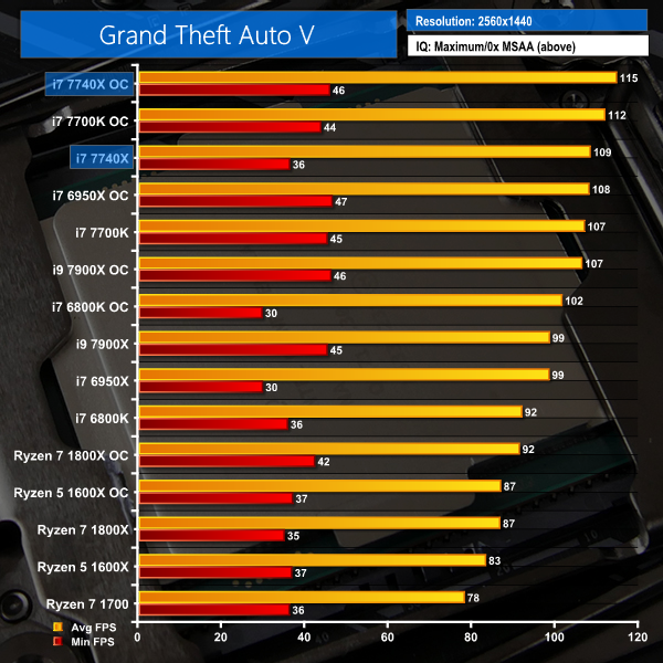 Even with the resolutions increased, the Kaby Lake and Kaby Lake-X Core i7 CPUs maintain their positions atop the charts. If you are a high-resolution gamer, the Core i7-7740X is a good CPU for your system. However, it does not offer a noticeable performance advantage over the i7-7700K and its cheaper LGA 1151 platform.