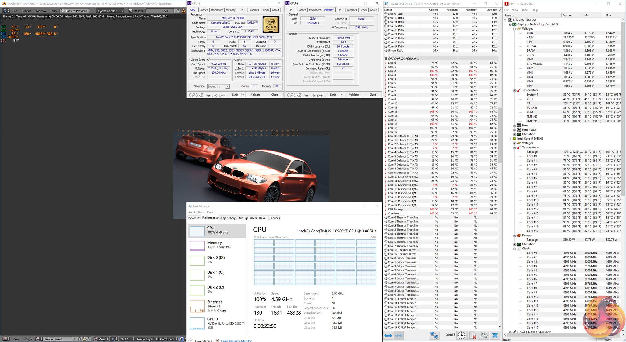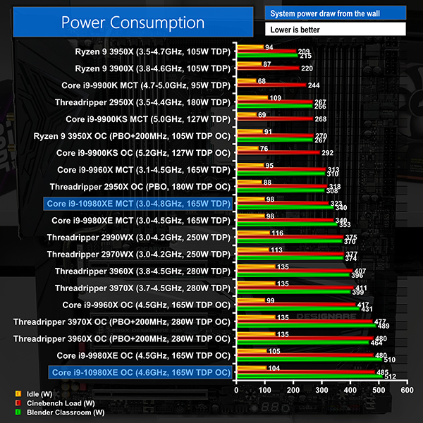 Just over half-a-kilowatt from the wall when rendering for extended periods in Blender is a hefty power consumption figure and pushes the strong motherboard VRM on our Gigabyte X299X Designare 10G motherboard and the 12V rail on our efficient Seasonic Prime Titanium 1000W PSU.