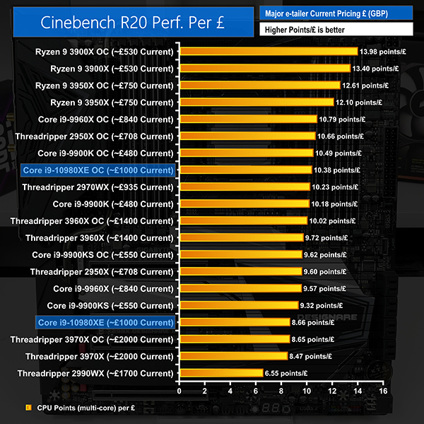 It doesn’t take a genius to work out that a $979 processor probably isn’t going to score particularly highly in Cinebench performance per £. Intel’s Core i9-10980XE is close to Threadripper 3970X value at stock, though the Intel chip even manages to leapfrog the 24-core 3960X competitor when the i9 is overclocked to 4.6GHz. That’s not a bad result at all. Well, until you look at the Ryzen 9 numbers, that is.
