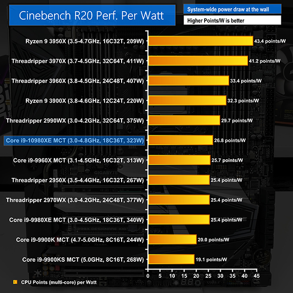 Unsurprisingly, the 10980XE cannot compete with 7nm-based Zen 2 parts for performance per Watt in Cinebench rendering. The Ryzen 9 3950X offers significantly better energy efficiency even though its performance level is similar to the flagship Core i9.