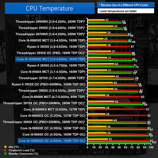 Temperature recordings were taken using a Corsair H100X 240mm AIO with 2435 RPM SP120L fans. Ambient temperatures were around 24°C. We do not yet have full data for our new Blender Classroom reading for all comparison CPUs. Competing Threadripper CPUs with the asterisk in the chart were tested with a Cooler Master Wraith Ripper TR4 cooler.