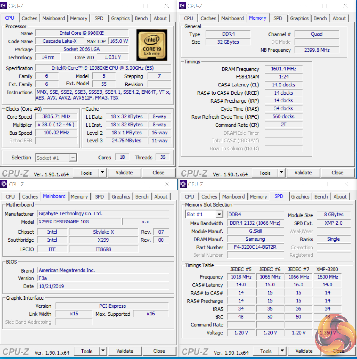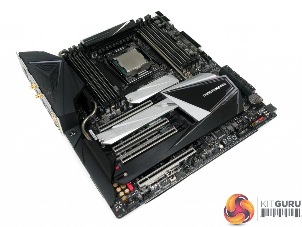 The partnering hardware of choice is the Gigabyte X299X Designare 10G motherboard, 32GB of 3200MHz CL14 DDR4, and a Seasonic Prime 1000W Titanium PSU.