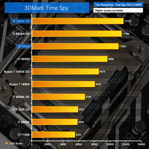 3DMark's Time Spy DX12 benchmark shows a liking for the 7900X. This benchmark scales well with core count in a manner that few games currently follow. It is, however, a promising insight to performance with potential future more multi-threaded titles.