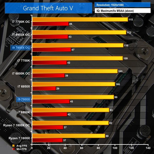 GTA V performance from the 7900X is a little surprising, given that Skylake architecture and a 4.0GHz clock speed should result in performance that handily outperforms the stock-clocked i7-6950X. That is, however, not the case. It seems that the rebalanced cache for Skylake-X is having a slightly negative influence on gaming performance, compared to Kaby Lake and Broadwell-E. The overclocked 6950X is slightly faster than the overclocked 7900X in GTA V at 1080P, despite the latter's 400MHz clock speed advantage. With that said, the Skylake-X 10-core is faster than Ryzen in GTA V (which is not surprising given GTA V's affinity for Intel architectures).