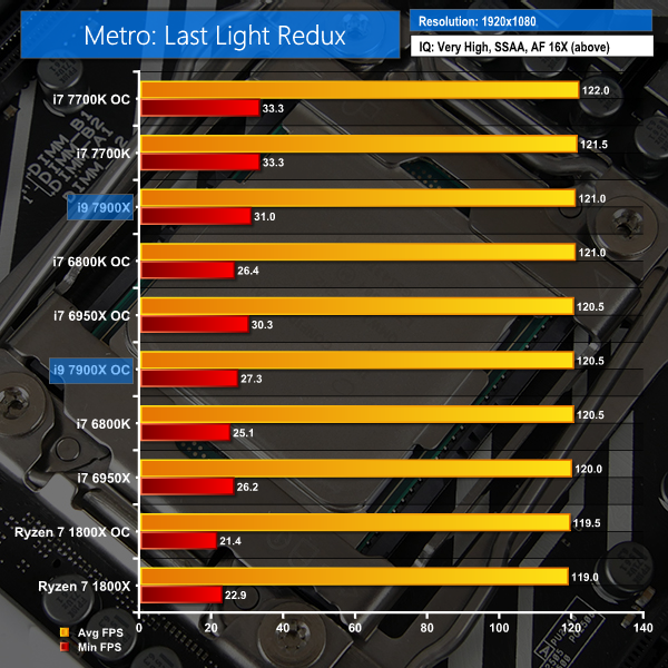 Even at 1080P, Metro: Last Light Redux is GPU-limited at 120 FPS. As such, all CPUs will perform pretty much the same in this title. Kaby Lake's Core i7-7700K is consistently the fastest part, with Ryzen 7 1800X propping up the pack. The Skylake-X 10-core sits nicely in between with strong minimum FPS numbers.