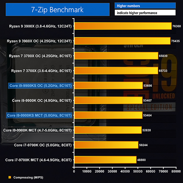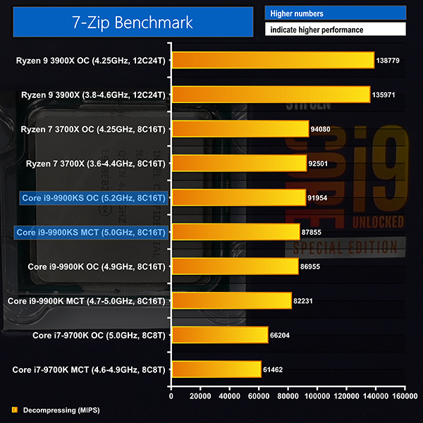 A 7% lead opens up for the 9900KS versus the 9900K in the 7-Zip decompression test. Intel’s eight-core chip narrows the deficit to AMD’s cheaper Ryzen 7 3700X, but the stock Ryzen 9 3900X still outperforms Team Blue’s 5GHz processor by a rather large 55%.