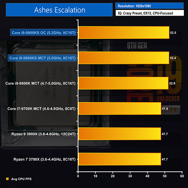 Ashes of the Singularity Escalation is fairly well multi-threaded in its CPU-focused test. Despite its thread count deficit versus the AMD Ryzen 9 3900X, Intel’s Core i9-9900KS takes a comfortable victory. The performance lift over the 9900K is slim in this game.