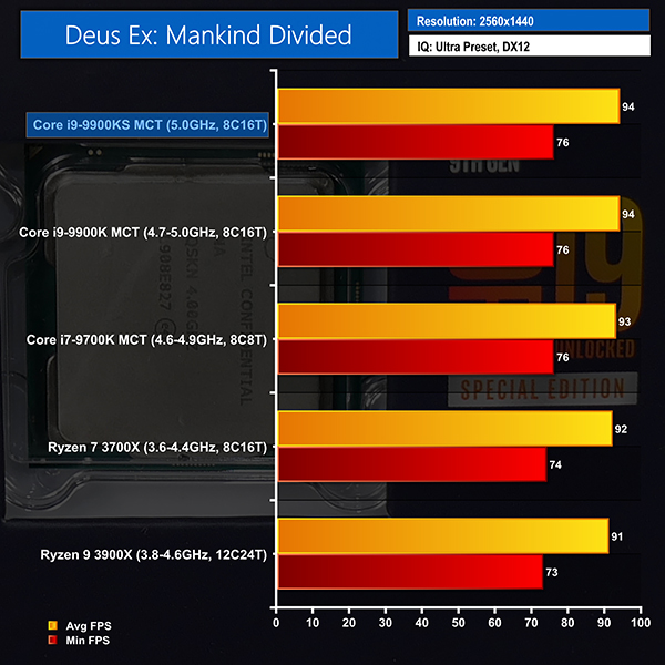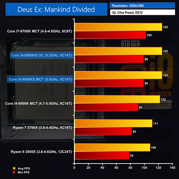 The 9900KS 5GHz eight-core chip hovers around the top spot in Deus Ex. The performance lead over the 300MHz slower 9900K is minor. However, the FPS advantage versus the Ryzen 3000 competitors is perhaps a little more noticeable for high refresh rate gamers.