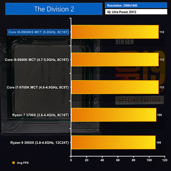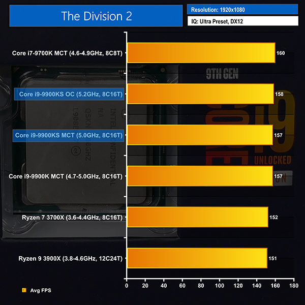 The 9900KS is close to the top spot in The Division 2, with the Core i9 only having its average FPS value beaten by Intel’s Core i7-9700K which lacks Hyper-threading. The 9900KS performance lead over Ryzen 9 3900X is slim but measurable.