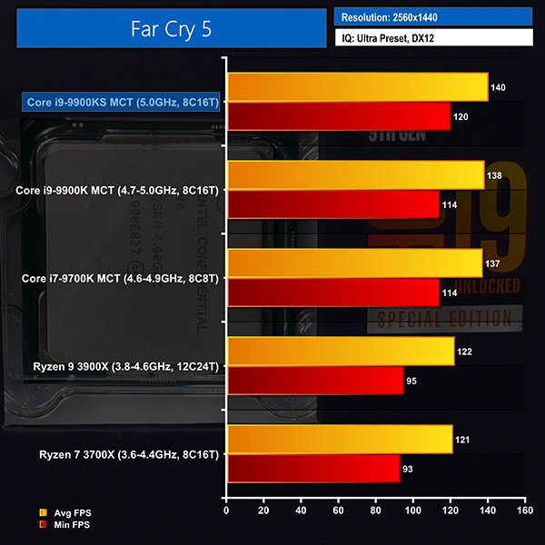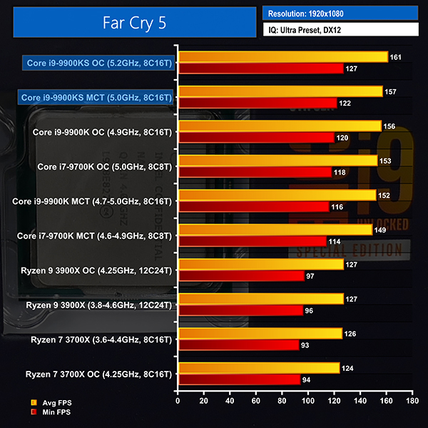 Far Cry 5 catapults the Core i9-9900KS to top position in our chart. Frequency is the key driver in this benchmark, so overclocking the 9900KS to 5.2GHz helps to open up an advantage versus our slightly slower 9900K.