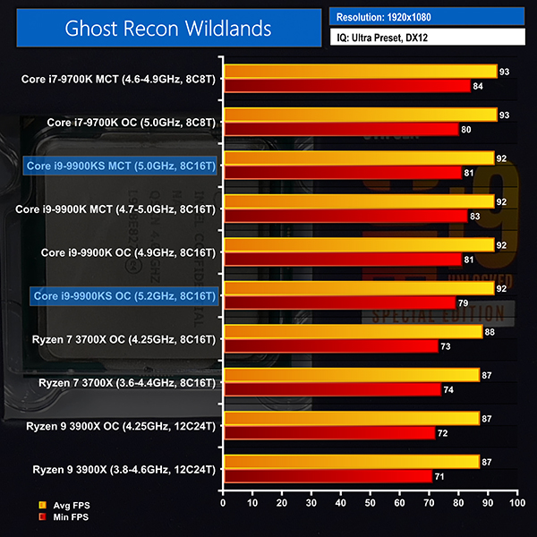 Interestingly, Ghost Recon Wildlands tends to favour Intel’s non-Hyper-threading Core i7 at the very top of the chart. The 9900KS comes in at basically the same performance level as the 9900K, except for minor run-to-run variations that limit this benchmark’s consistency. AMD’s Ryzen 9 3900X is slower than the Core i9-9900KS, but the deficit is not huge in this title.