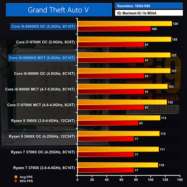 Grand Theft Auto V is another title that tends to favour Intel’s frequency-rich processors. We see the Core i9-9900KS boosted to top position thanks to its frequency advantages stock versus stock and overclocked versus overclocked.