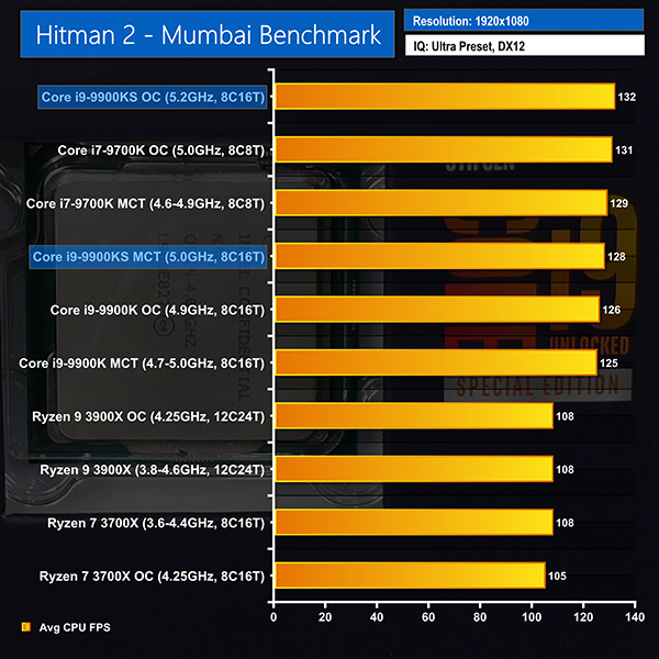 Another strong showing from the 9900KS in Hitman 2, this time beating the 9900K's average frame rate by 3 FPS stock versus stock. Intel's lead over AMD is clear in this title, albeit only most relevant to high refresh rate gamers.