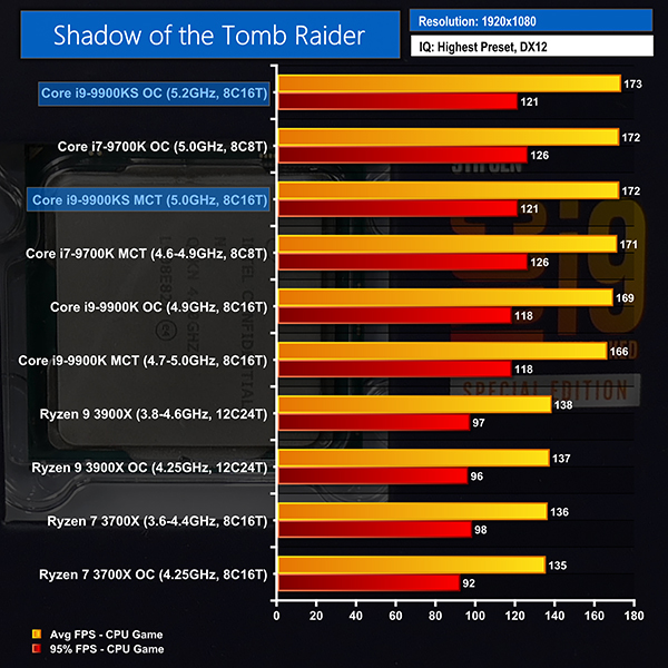 Another chart-topping performance for the 9900KS in Shadow of the Tomb Raider. Realistically, the performance differences between the 5GHz i9 and the i7-9700K are within margin of error. However, the 9900KS manages to comfortably outperform AMD’s Ryzen 9 3900X, albeit at a frame rate that is already high enough even for most high refresh rate gamers.