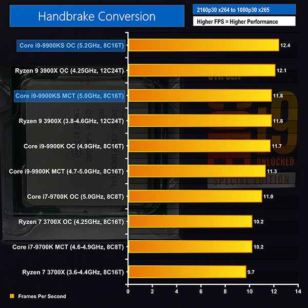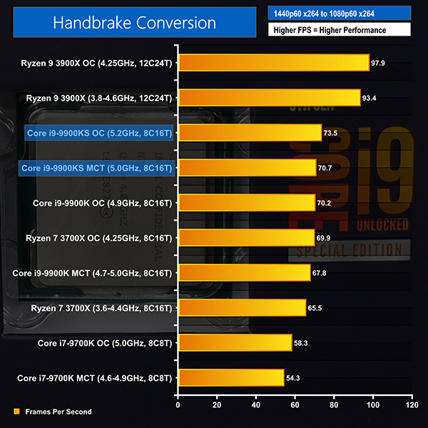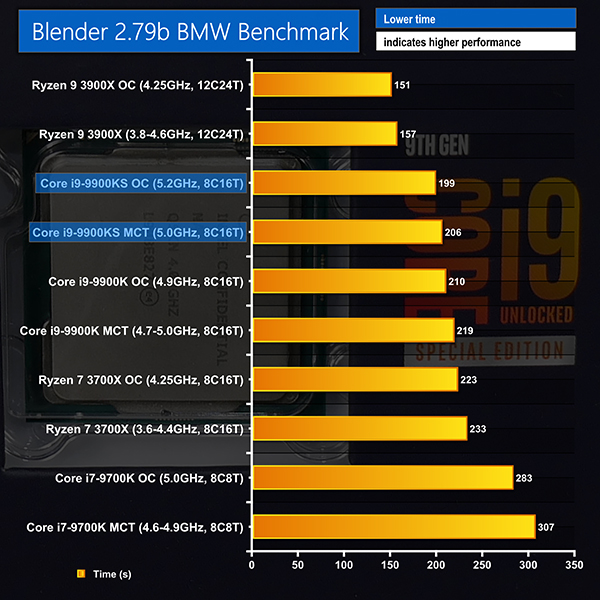 A 13 second time reduction versus the 9900K gives Intel’s 5GHz special edition part a 6% lead in Blender. Versus the similarly priced Ryzen 9 3900X, however, the 9900KS is beaten by a sizeable 49 seconds or 24%.