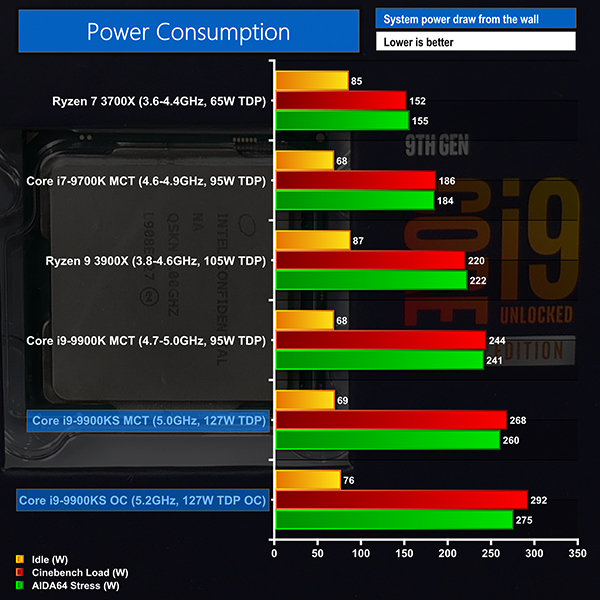 This results in the 9900KS showing the highest power consumption figures for all of today’s comparisons. The increase versus the stock – 4.7GHz – Core i9-9900K is 24 Watts in Cinebench.