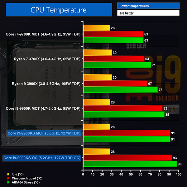 Given the high power draw, it is absolutely no surprise to see high operating temperatures from the Core i9-9900KS. We were forced to upgrade our 240mm Corsair H100X AIO from 1700 RPM fans to 2435 RPM Corsair SP120L alternatives in order to keep stock 9900KS temperatures in check.