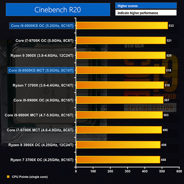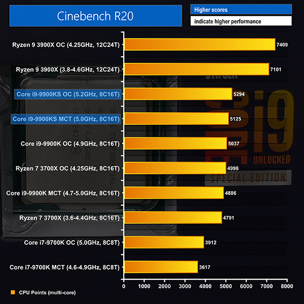 The 5GHz 9900KS is 5% faster than the stock 9900K in Cinebench R20 multi-threaded performance. AMD’s Ryzen 7 3700X is also beaten by 7%, though it is a cheaper product.