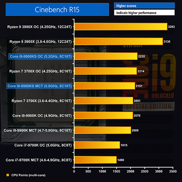 Starting with Cinebench R15, we see Intel’s Core i9-9900KS deliver multi-core performance that is 7% faster than the stock 9900K. Overclocking to 5.2GHz adds another 84 points or 4% to the 9900KS’s score.