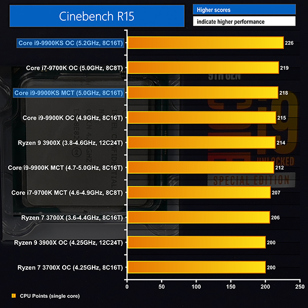 Single-threaded performance gives the 9900KS a strong victory in Cinebench R15. Hovering around the top of our chart, even the efficient Zen 2 architecture cannot claw back enough performance to offset the sheer frequency advantage for Intel’s Coffee Lake Refresh chip. It really is impressive to see how far Intel has pushed the 14nm node for high-frequency performance. The 9900KS scores in this benchmark typify that point.