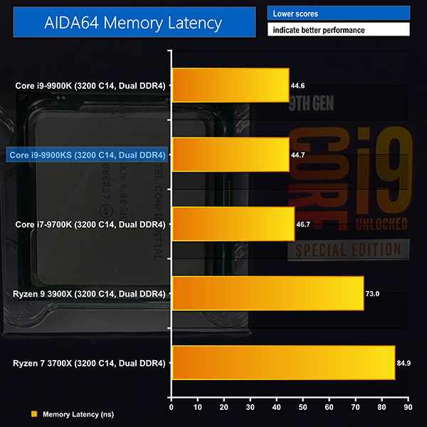 Intel’s Coffee Lake Refresh chips dominate AMD’s Zen 2 competitors in terms of memory latency. This is one of the factors that will help the 9900KS outperform AMD’s Ryzen 3000 CPUs in gaming, on average.