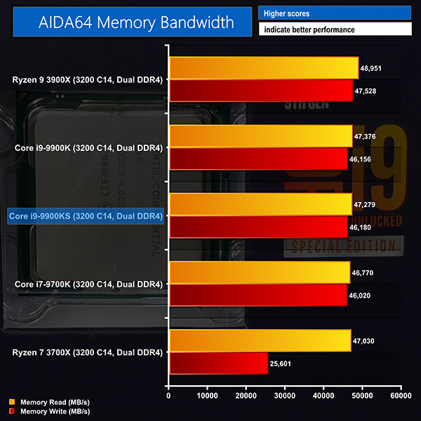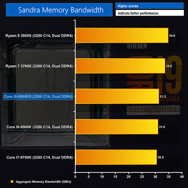 Memory bandwidth is an area where AMD’s Zen 2 architecture in Ryzen 3000 CPUs tends to very slightly outperform Intel’s Coffee Lake Refresh competitors. The Core i9-9900KS does not change that situation.