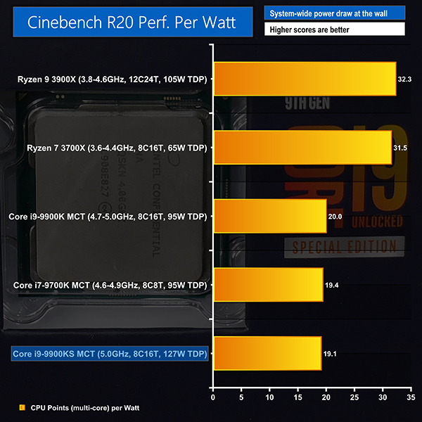 Unsurprisingly, the performance per Watt from Intel’s Core i9-9900KS is poor, just as we see from the other high-frequency Coffee Lake Refresh parts in productivity applications such as Cinebench and Blender. The difference in efficiency between 7nm Zen 2 and highly clocked Coffee Lake Refresh 14nm++ chips is gaping.