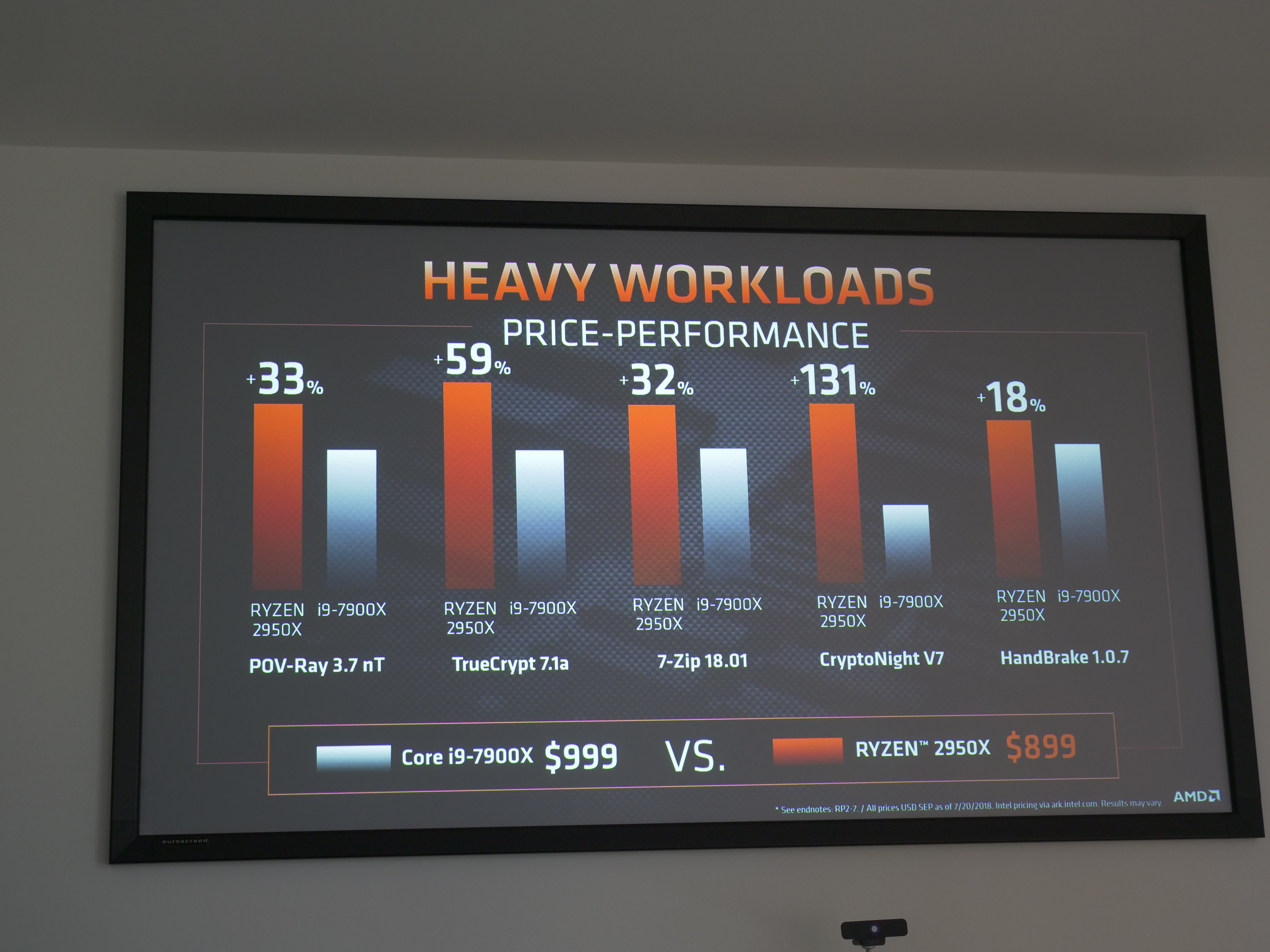We'll have to wait for reviews to get final performance metrics, but according to AMD, the 2950X has a similar IPC to the Core i9-7900X. Price to performance is where AMD continues to shine though, with the 2950X ousting the Core i9-7900X in a range of ‘performance per dollar' tests. Those looking to switch from a 16C 1950X to a 16C 2950X will be looking at anywhere between a 5-25 percent improvement in performance depending on the software. You can see some other performance metrics in the slides above.