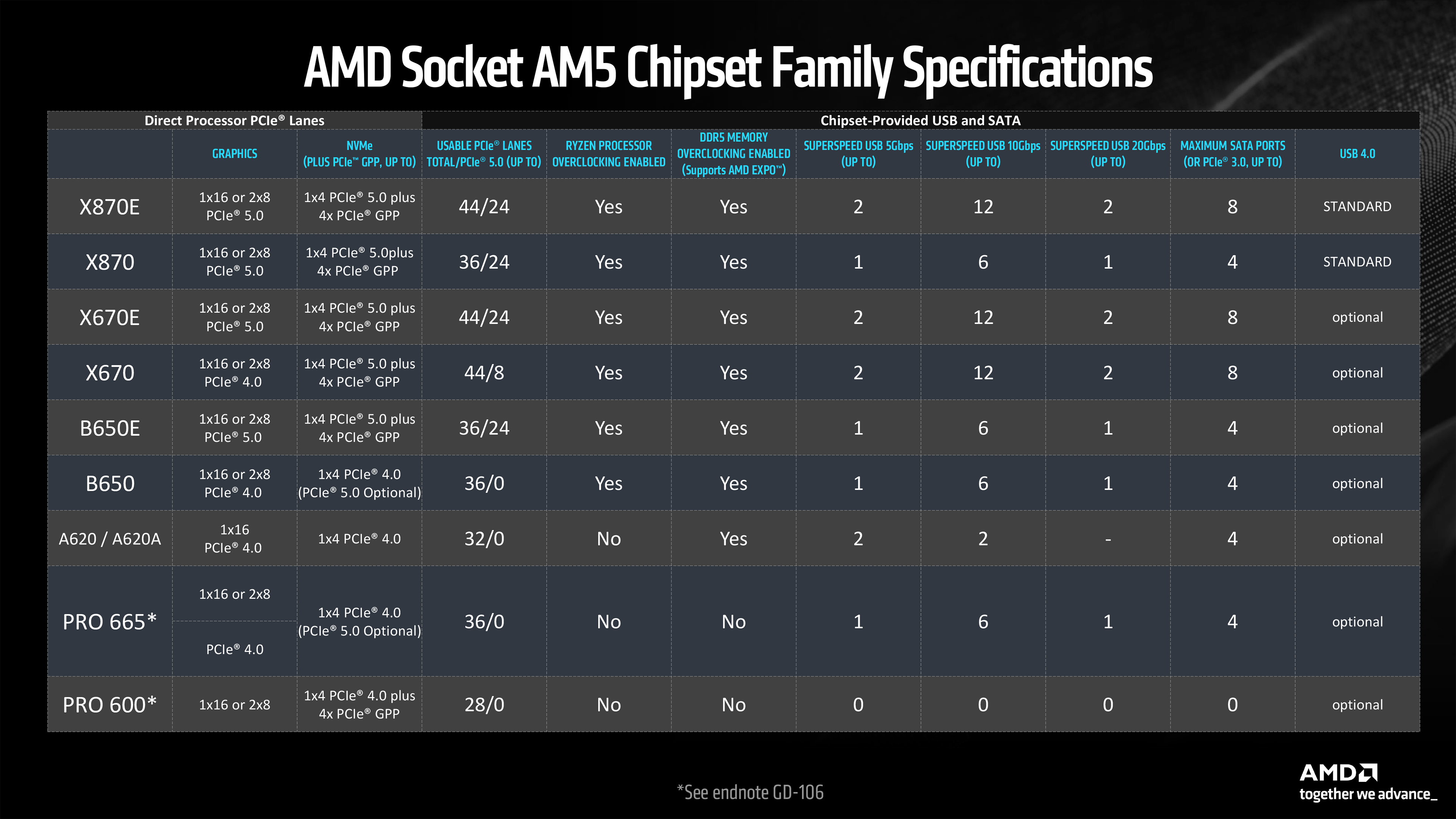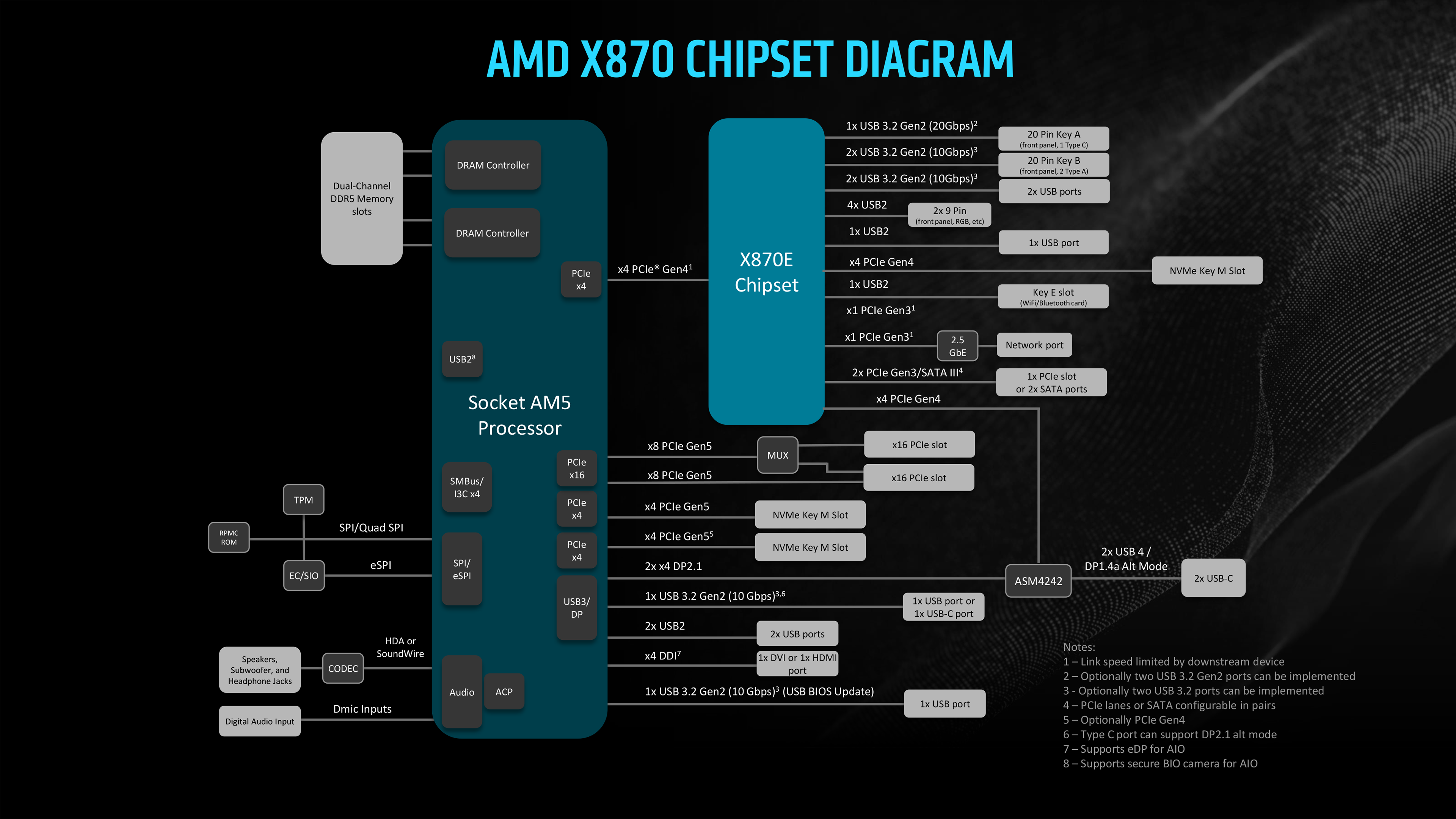 At the top of AMD's current-gen motherboard stack is the X870E, followed by X870, and then B850. Typically, X870E motherboards will set you back over £400 and are intended for the high-end enthusiasts seeking the best possible performance through overclocking. This chipset also enables the use of ultra-fast DDR5-8000 memory. In the past we've said the every-day gamer is typically better off saving some money with a Bx50 motherboard and putting more money into the graphics card, but we'll have to wait for our reviews of X870E boards before passing judgement.