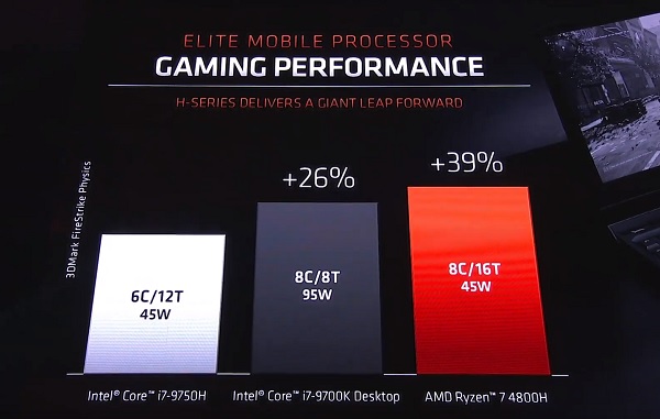 During AMD's presentation, we see slides that show that an Intel Core i7-9750H has roughly 26 percent lower performance than a desktop Intel Core i7-9700K. In order to deliver ‘desktop class' performance, AMD designed the Ryzen 7 4800H to beat that benchmark, delivering a 39 percent performance increase over the Core i7-9700K in a 3DMark Firestrike Physics test.