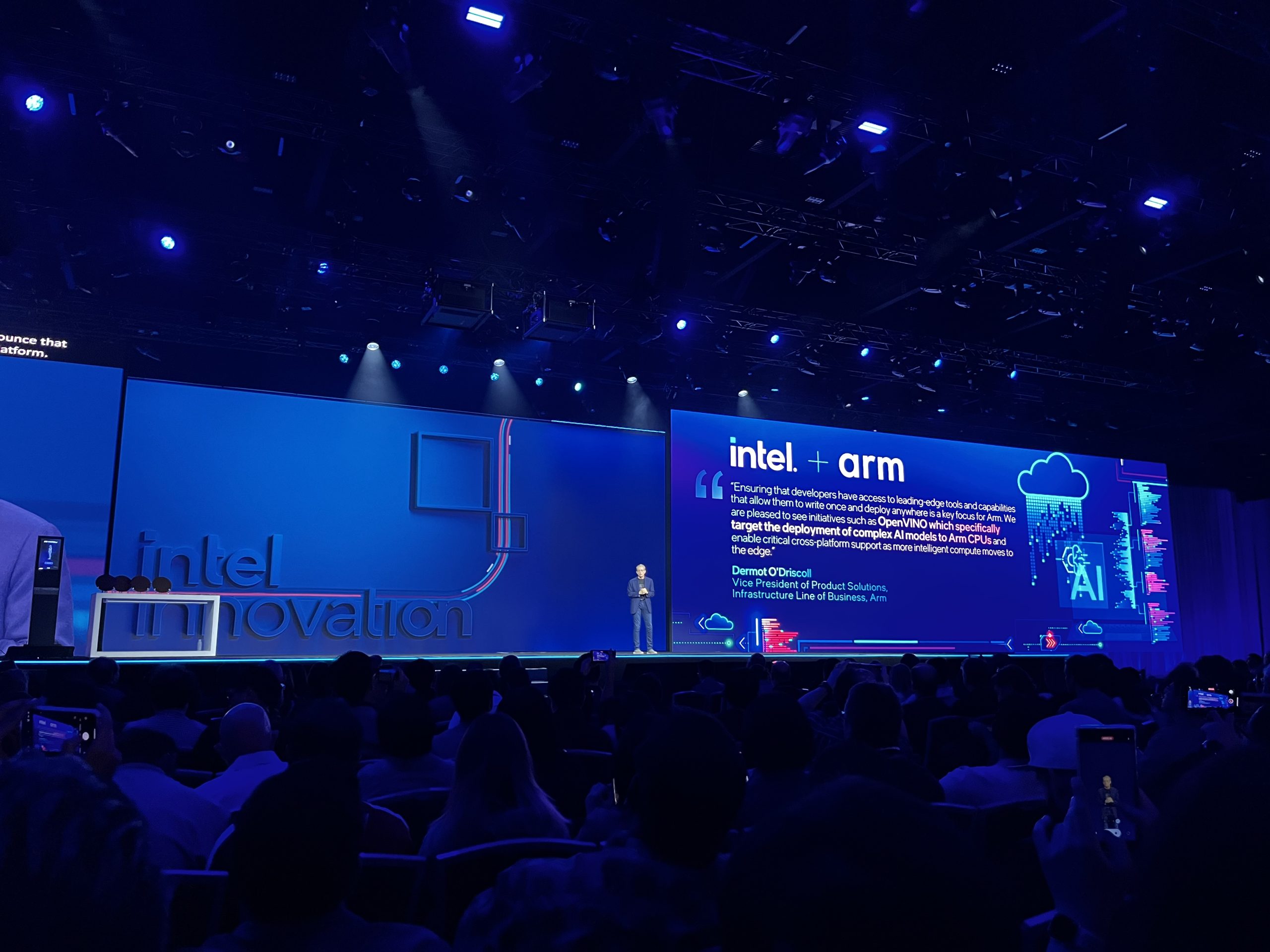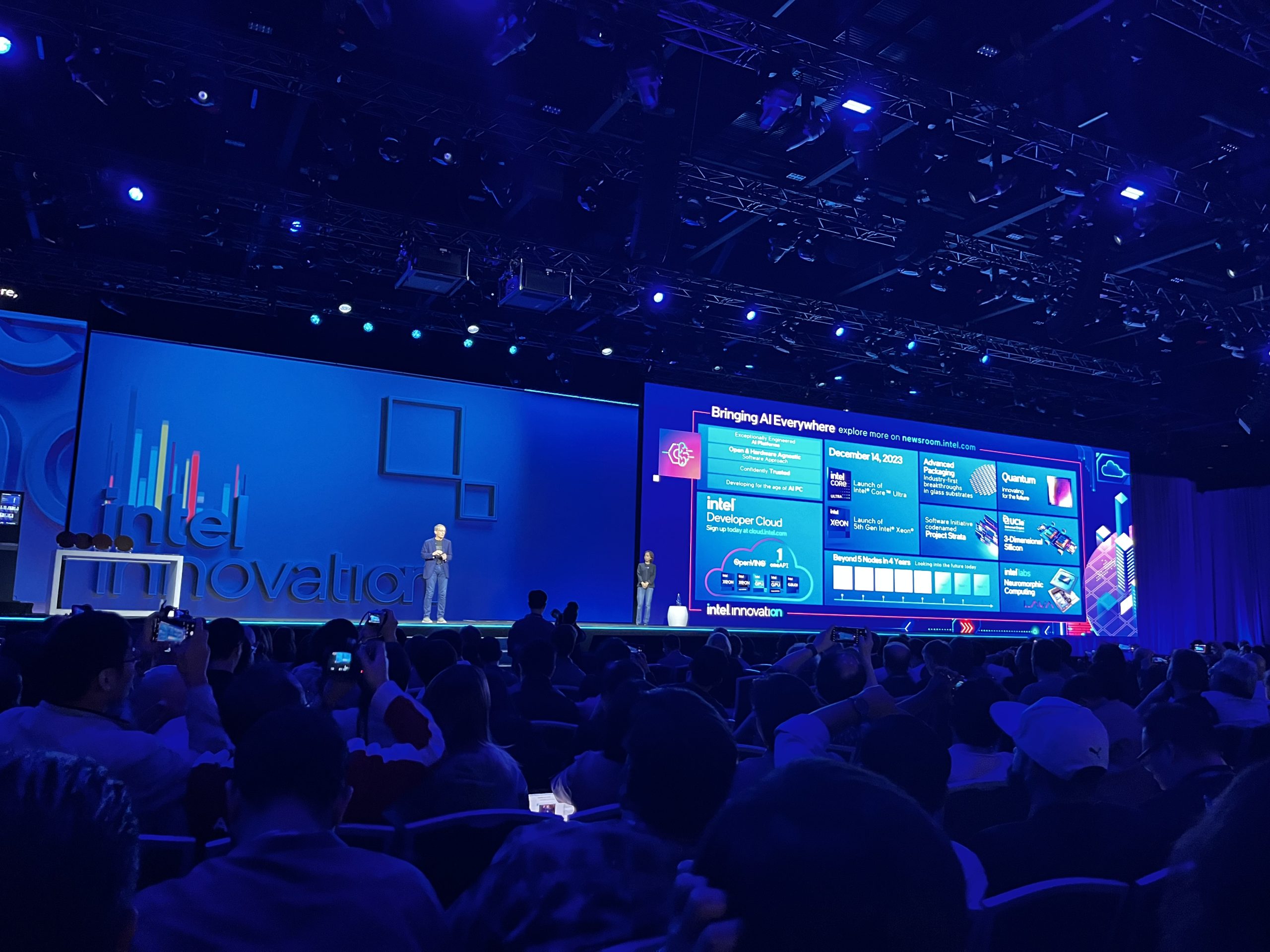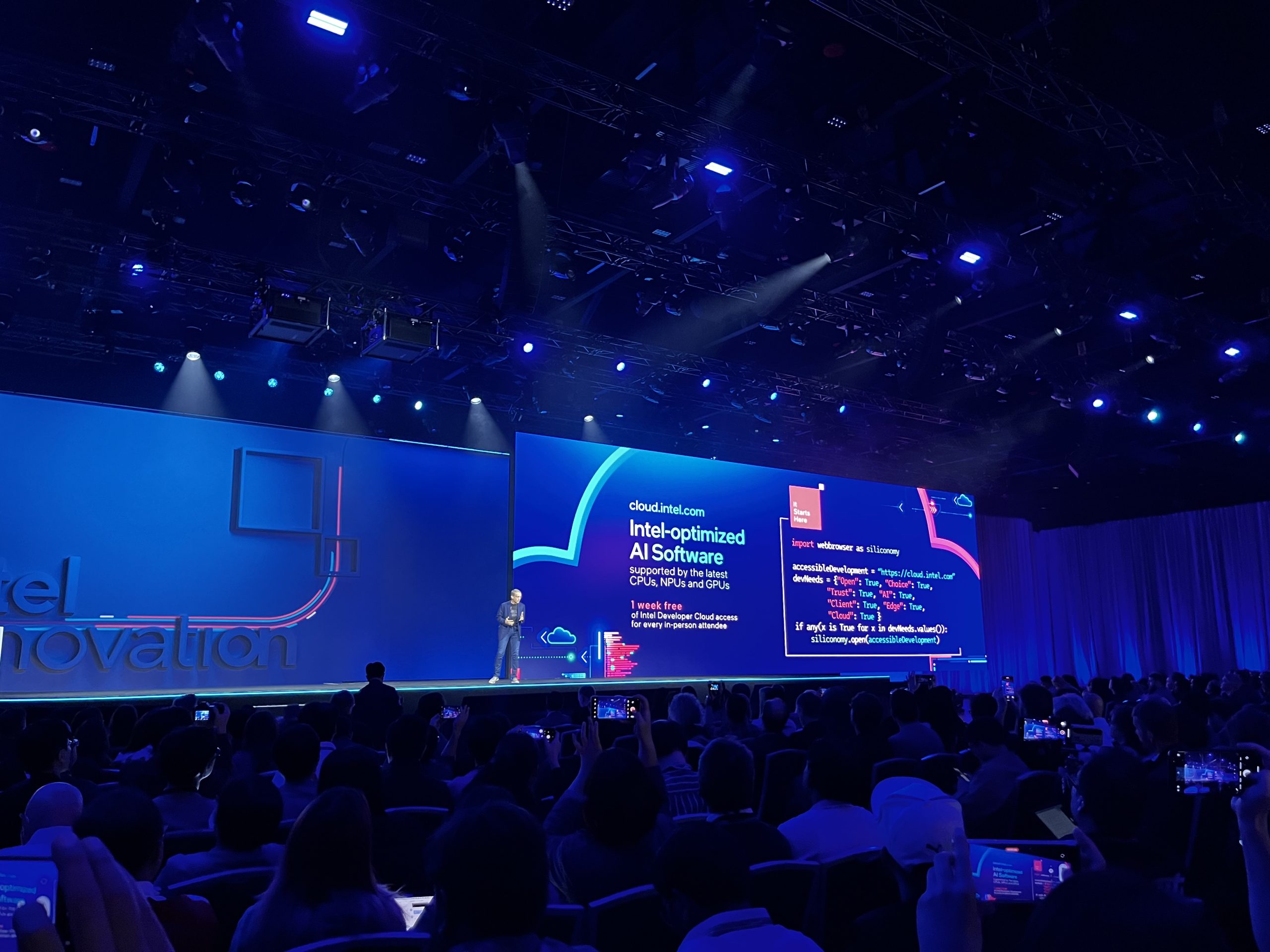 Intel Innovation 2023 officially kicked off today, with media, analysts and Intel partners gathering from around the world. As always, the event started with a keynote from none other than Pat Gelsinger, Intel CEO. The running theme this year is undoubtedly AI, with Intel positioning itself to be a key leader in this rapidly growing computing segment. Specifically, Intel wants to enable developers with the tools to create locally run AI applications, enhancing user privacy and paving the road for AI enhancements for all kinds of use cases.