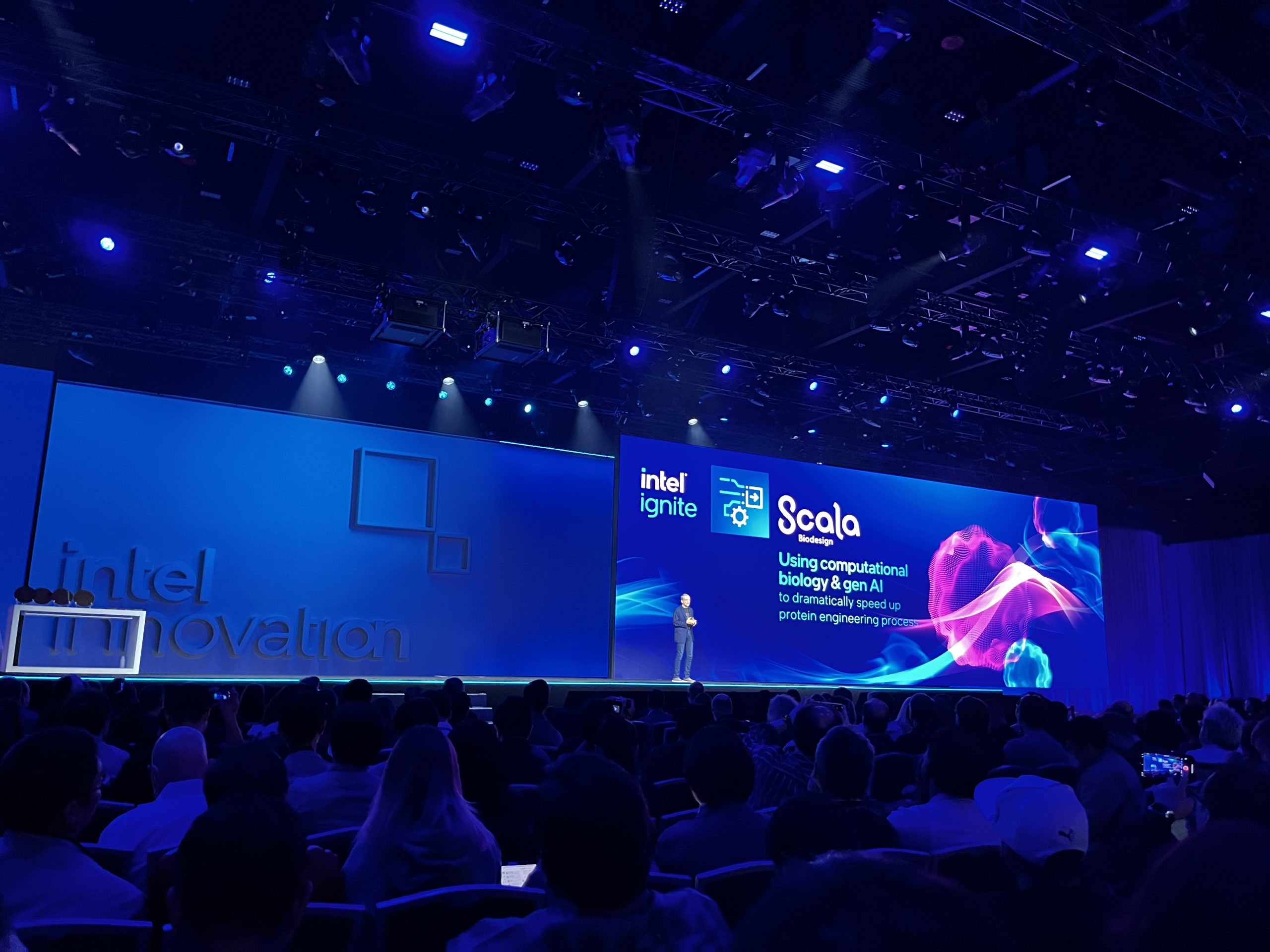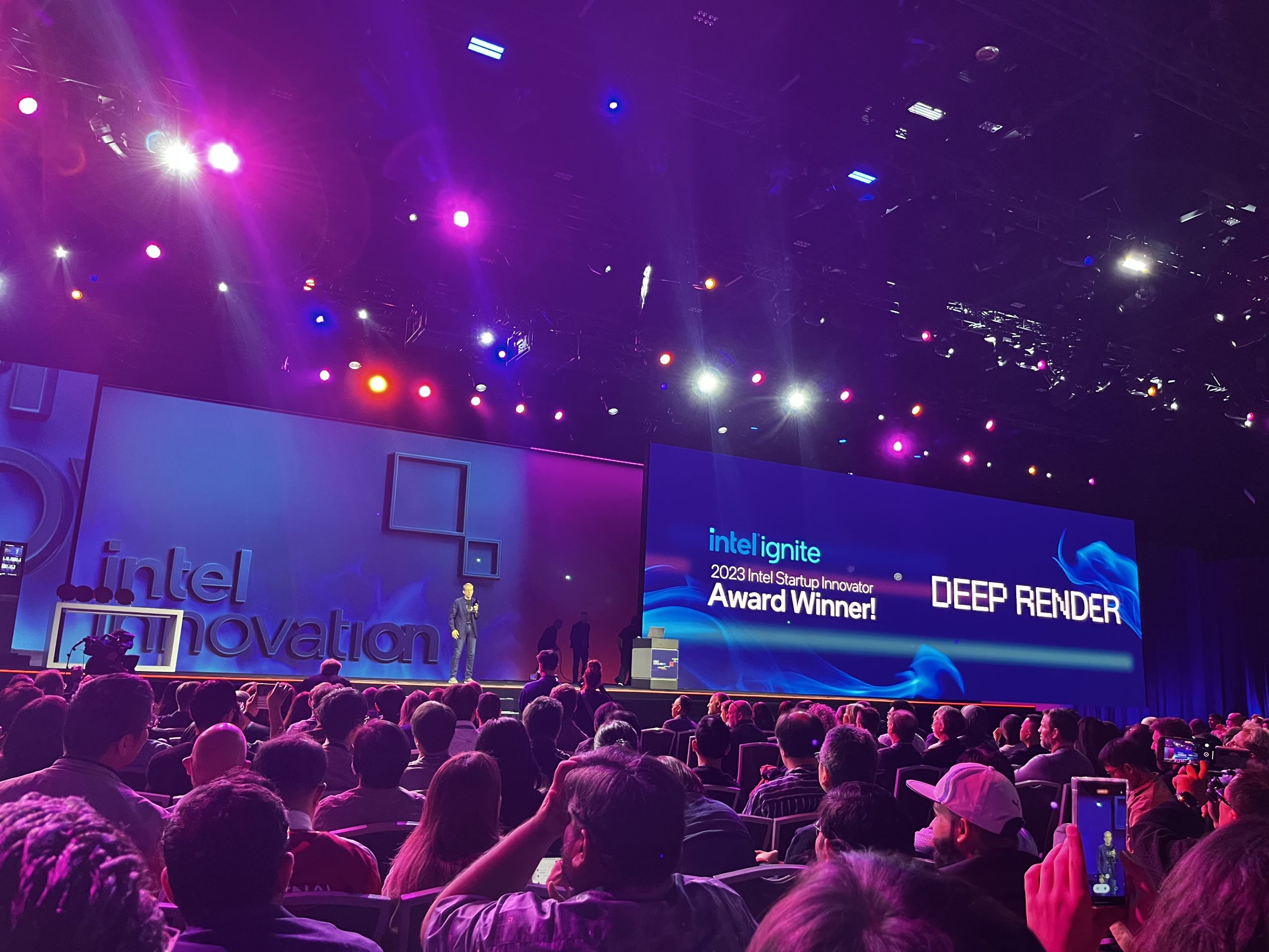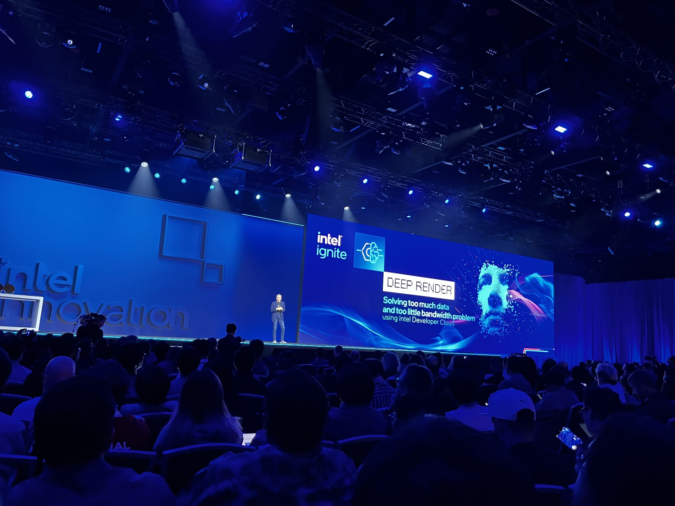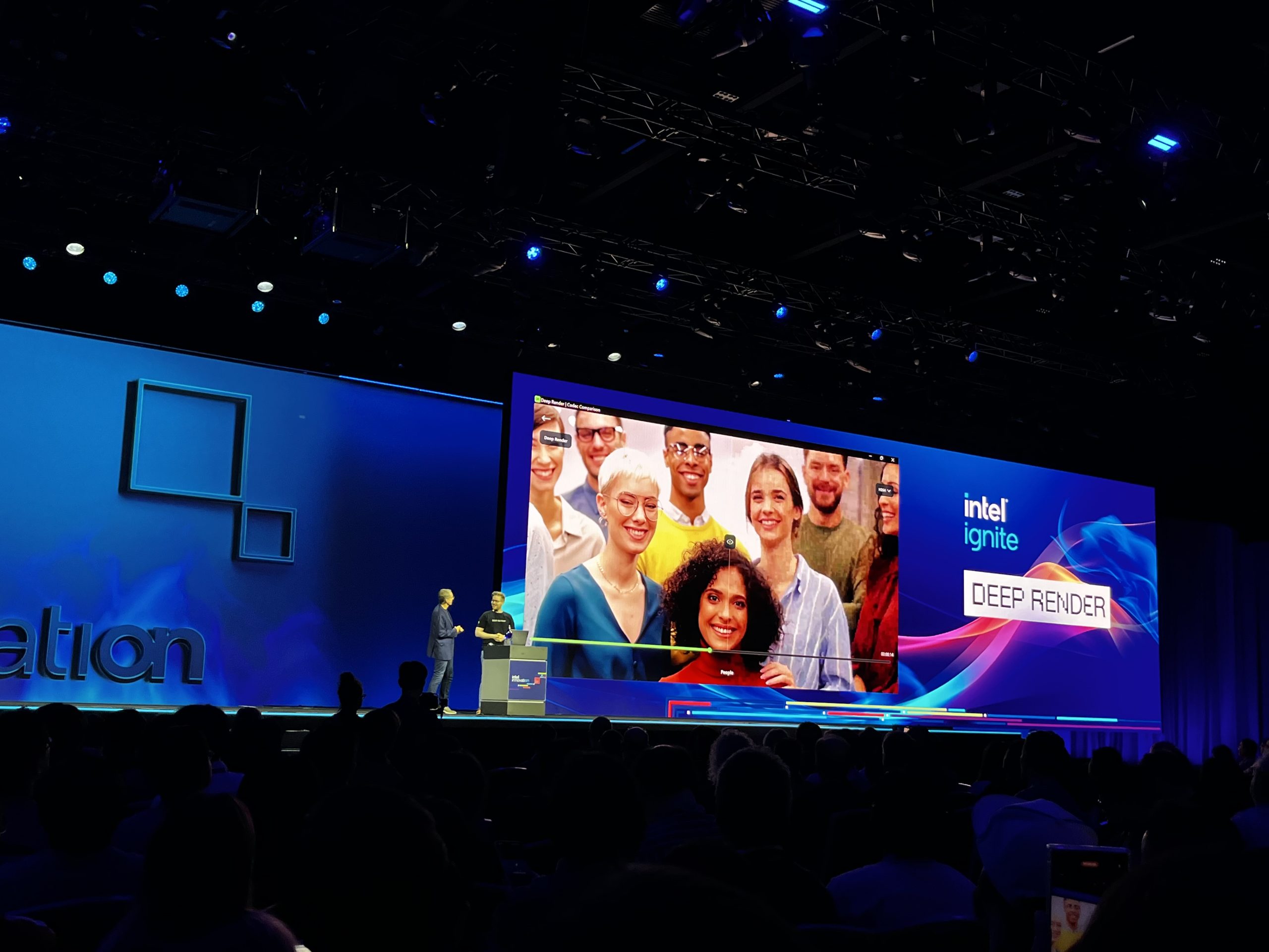 Love it or hate it, AI is the future, with the tech industry at large focusing keenly on taking advantage of machine learning and AI to enhance a number of industries. A few novel use cases for AI were demoed on stage today – the first comes from this year's Intel Ignite innovation winner, Deep Render, a company working on AI driven compression technology. Currently, Deep Render's algorithm has enabled 5X smaller video file sizes but they want to scale this up to 50X. In a comparison video shown on stage, we see a small video clip running in H.264 compared to the Deep Render compression solution and the results were quite impressive, delivering a notably sharper image with less artefacts, while also being 5X smaller than the H.264 video, which showed plenty of artefacting. The use cases here are numerous, with the ability to shrink download sizes. This could have huge implications for streaming services and media archives, reducing bandwidth use due to smaller file sizes, while also saving on space in data centres. If this could be applied to games, we may start to see a reduction in the number of 150GB+ downloads to more sensible numbers. Smaller files and higher quality should make everyone happy.