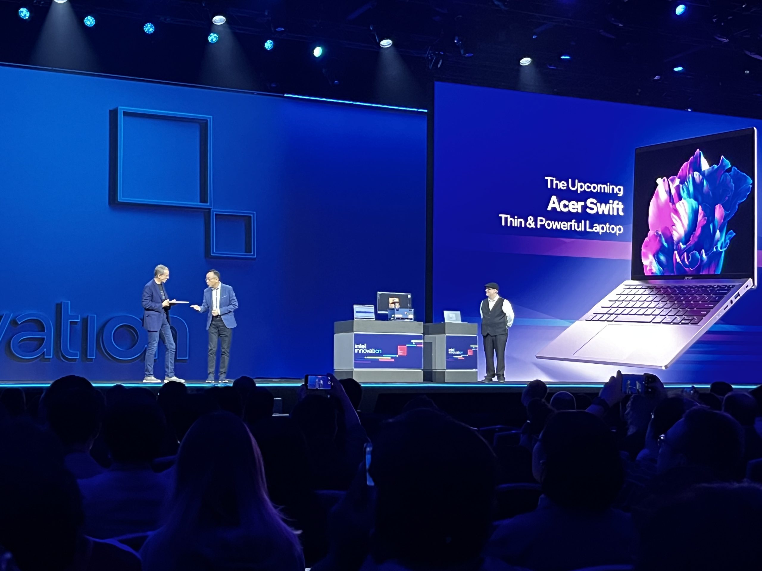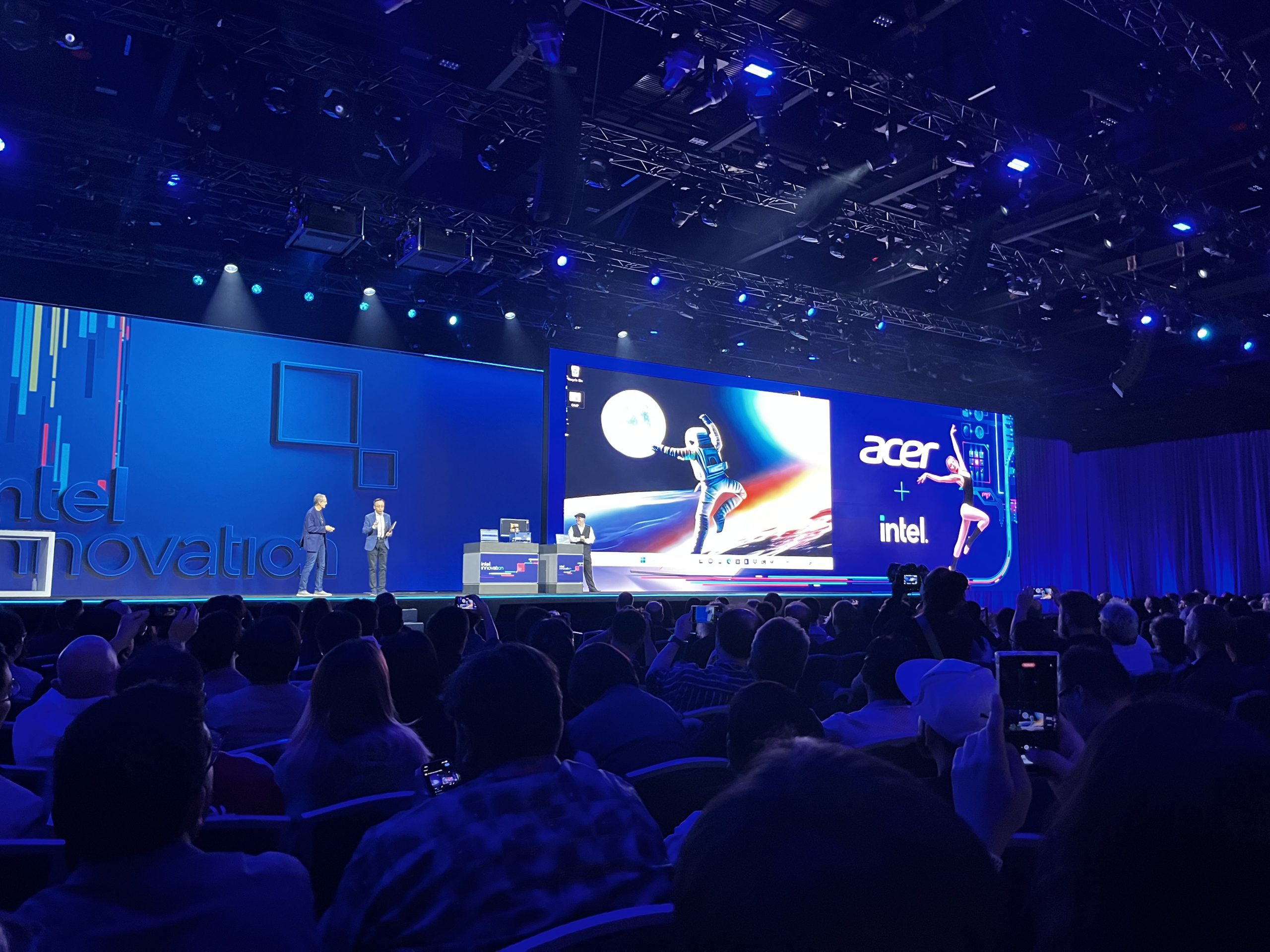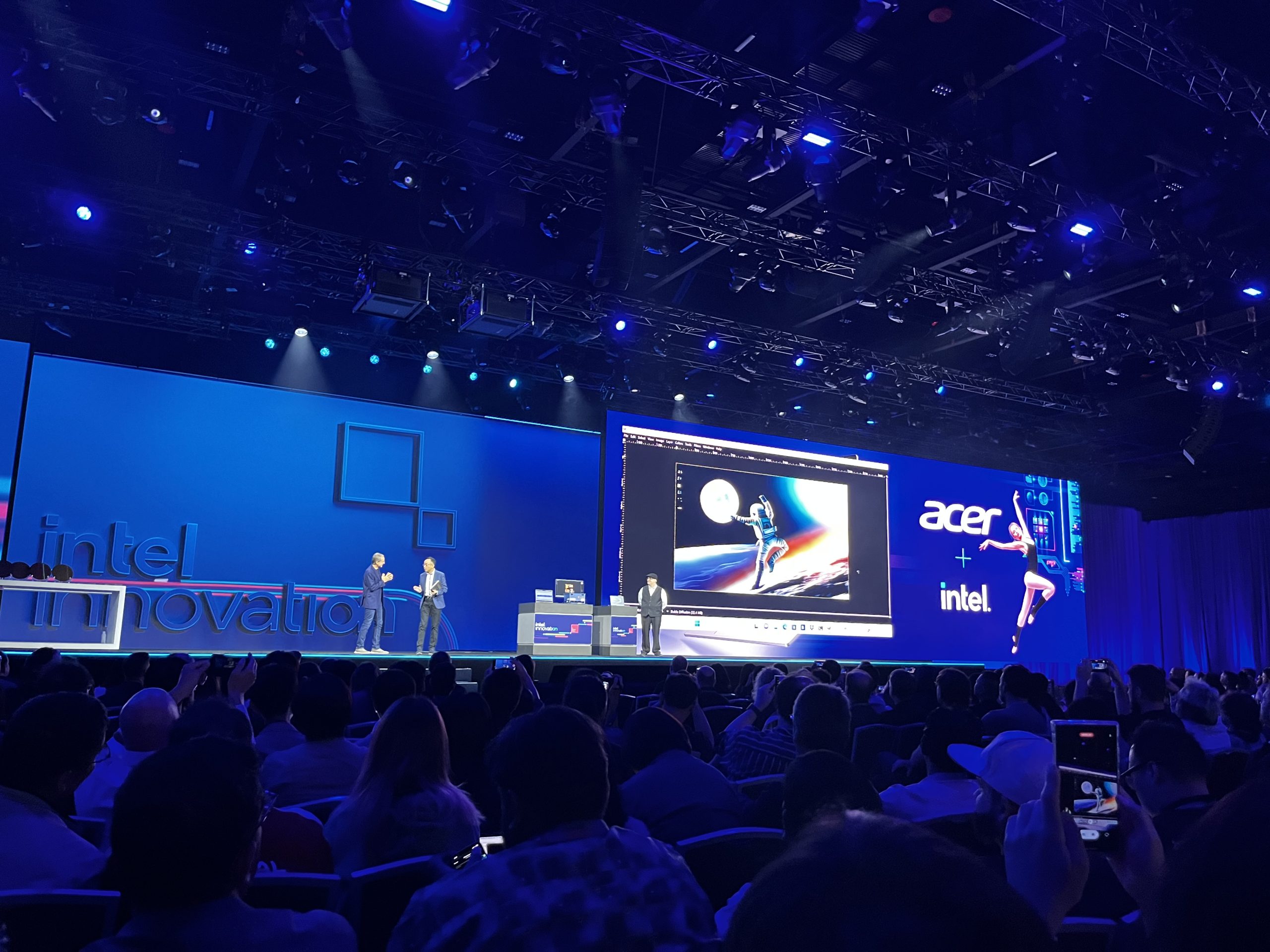 Intel will be looking to usher in the age of the AI PC, with efficient chips that can run local AI-powered apps later this year with the first Intel Core Ultra processors, arriving in December. This will be the first chip to use the Intel 4 node, packing EUV, foveros packaging, AI acceleration, WiFi 7 and a hybrid architecture with new P and E cores. In a demo, an Acer representative came up on stage with one of the first Intel Core Ultra-powered laptops. Using an application leveraging OpenVINO, the laptop was able to generate an AI image almost instantaneously, vastly speeding up stable diffusion.