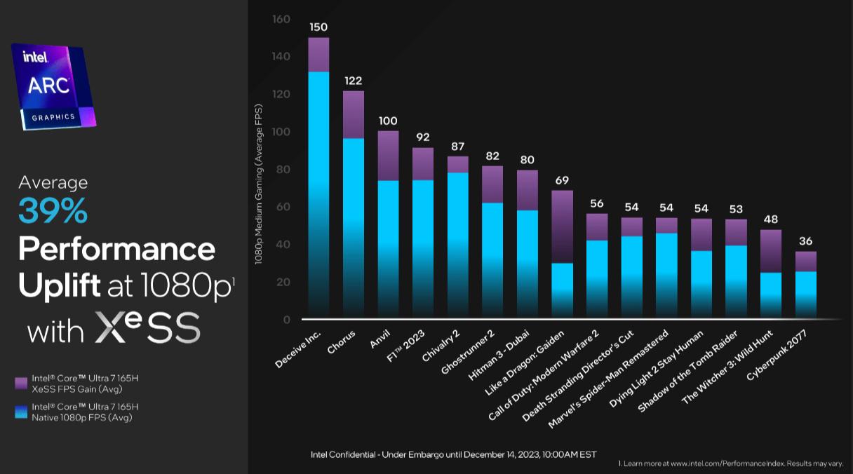 If you go a step further and enable Intel XeSS, you'll get even higher levels of performance thanks to AI upscaling techniques to save on performance. You can see in the slide above from Intel that the gains can be pretty significant in a lot of titles.